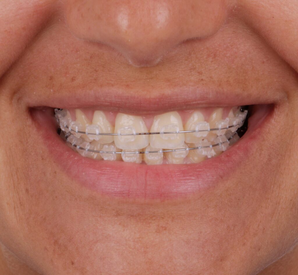 O movimento dentário ortodôntico também pode ser realizado através da colocação de brackets cerâmicos, cimentados diretamente nos dentes durante o período de tratamento e não podem ser removidos pelo paciente. Mensalmente, o paciente desloca-se à clínica para realizar consultas de controlo.