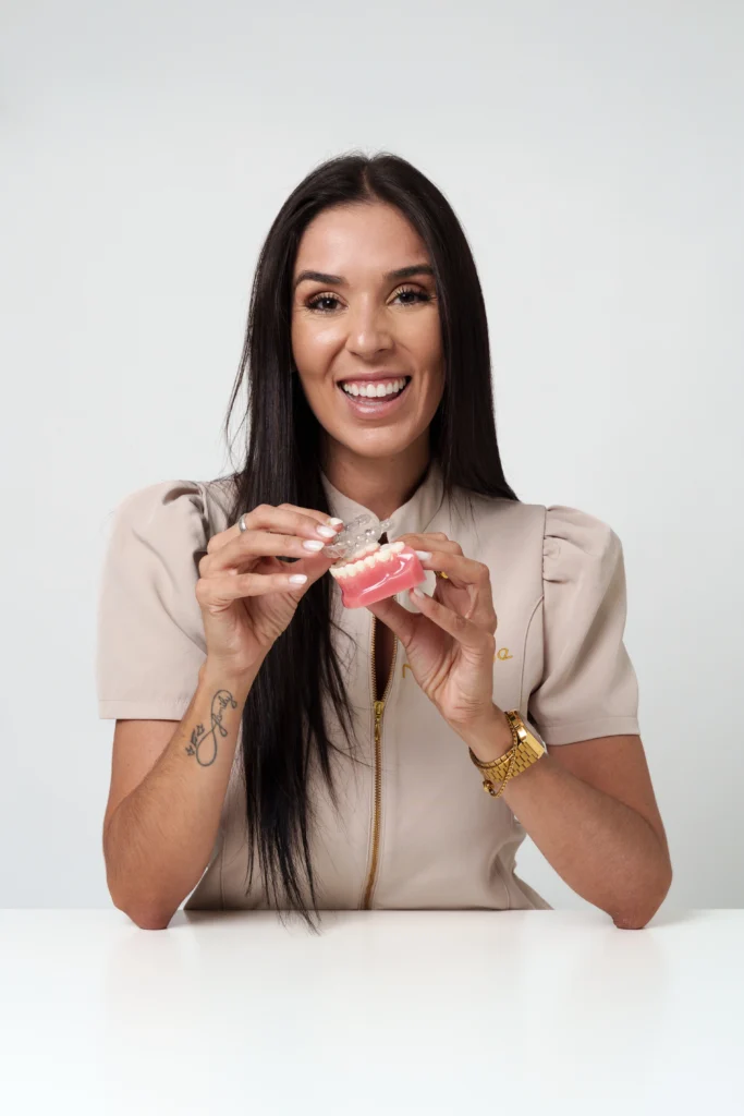 Praticamente invisível, confortável e removível, permitindo que o paciente coma e escove os dentes normalmente.